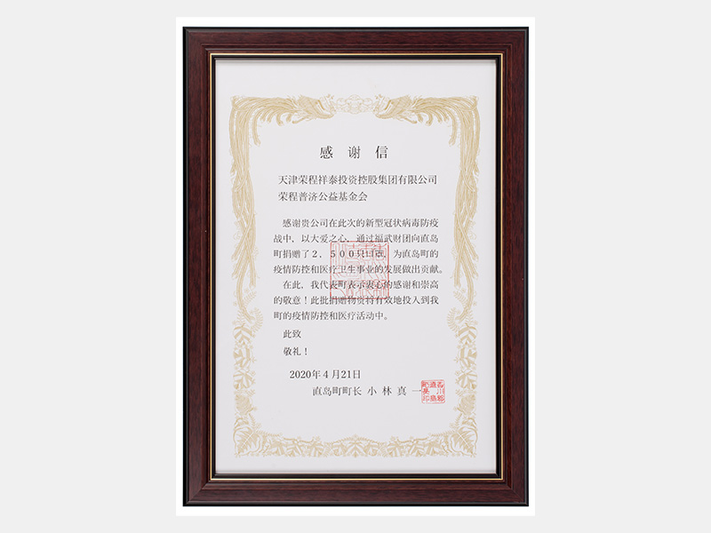 捐贈直島町2500只口罩-感謝信